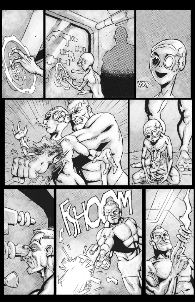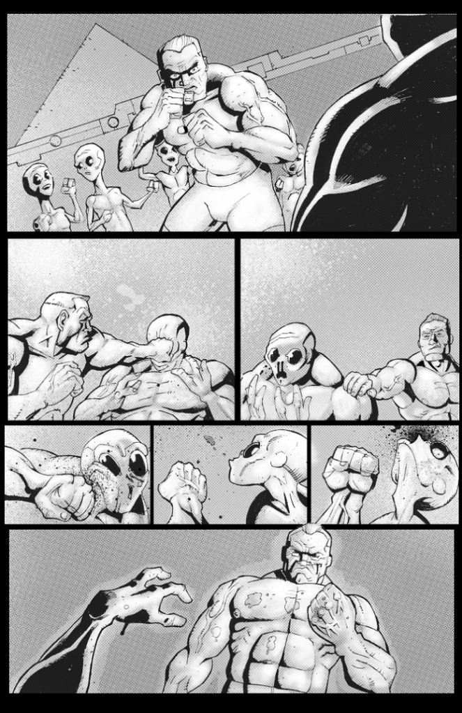 “Enter: Ibai Canales (insert probe joke here)–an amazing artist who not only appreciates my sick sense of humor, but also produces the kind of expressionistic cartooning this project needs to land the jokes and sell the fights. And as you can see with these preview pages–Mr. Canales does so in spades!