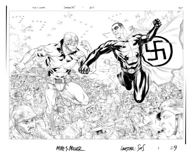 Written and illustrated by Miller, Lonestar is a superhero action/adventure featuring a main character designed as a “star-spangled” hero in the same vein as Wonder Woman or the Fighting American, but in Lonestar’s case, he’s outfitted like a “Captain Texas” version of F-Zero’s Captain Falcon.