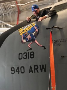 The design for “Old Grandad” includes a buff, Atlas-inspired rendition of Uncle Sam quite literally bearing the weight of world on his shoulders. TenNapel had the honor of personally unveiling the nose art, after which Airmen from the wing gifted him a large piece of sheet metal featuring his design.