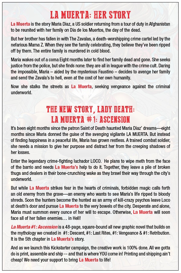 Backers can get a digital version of La Muerta: Ascension for $6, while physical copies start at $20. As per usual with previous Coffin Comics crowdfunding campaigns, there are tons of swag and extra options for those who spend extra cash, including multiple variant covers, a hardcover edition, art prints, a set of “Metallicards”, and bundles including previously-released Coffin Comics books. There also several stretch goal bonuses, so it’s quite likely that you will indeed get more bang for your buck if you choose to buy in.