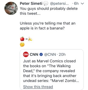 As we (accurately) reported yesterday, Image Comics has ended the long-running series The Walking Dead this week after 193 issues. However, the definitely-not-fake-geek-guys-and-gals at CNN chose to tie The Walking Dead‘s conclusion to Marvel’s announcement of a new Marvel Zombies series, incorrectly reporting that Marvel is the publisher of both.