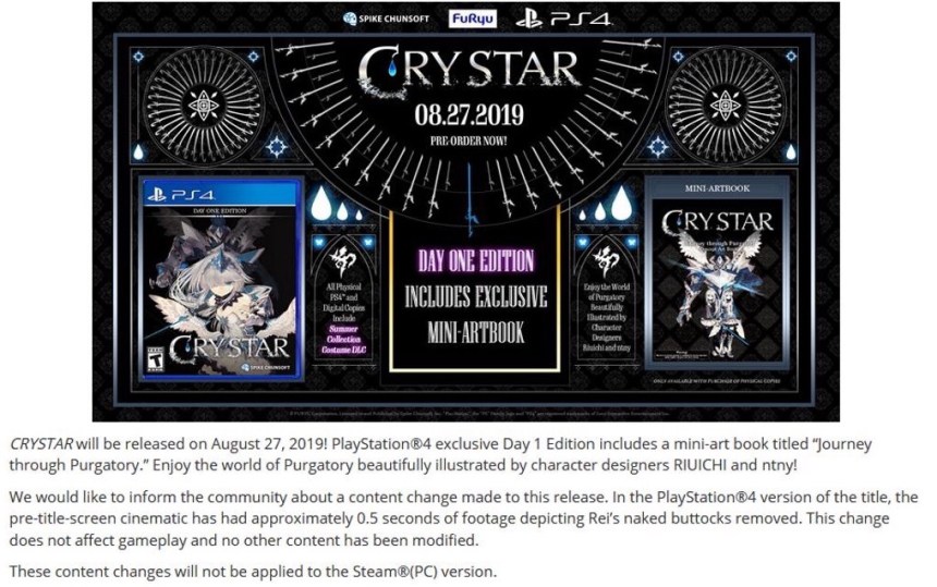 So there you have it, the censors at Sony strike again. This time they were insistent on removing 0.5 seconds (HALF a second) from Crystar, while the changes made to Conception PLUS. Fortunately, there is an uncensored version of Crystar coming to Steam, though no such option exists for Conception PLUS. At least these details were disclosed ahead of time instead of trying to pull a fast one of censoring th game via a day one patch, a la Devil May Cry V.