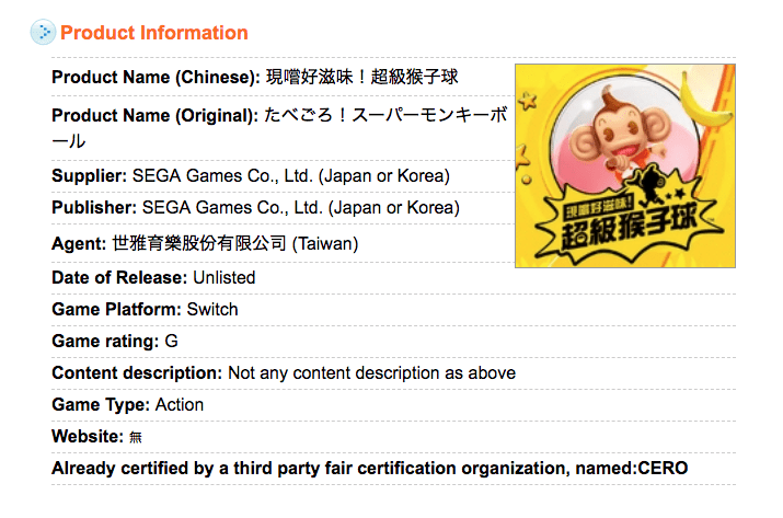 Taiwanese rating points to a new “Super Monkey Ball” game on the horizon