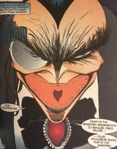 As for the artwork, I find Tim Sale’s art to be a perfect match for Batman, particularly with mystery-toned stories. I fully acknowledge that Sale’s character designs may not please everyone. His focus on differentiating mouths may not always be to your taste. You may not care for Bruce’s curved lower lips, the Joker’s exaggerated smile, and I myself don’t prefer the sharp-toothed, mutated look of the Penguin (above) which was so prominent in the years following Batman Returns.