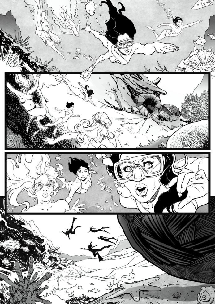 On Monday, independent comic book creators Gilbert Deltrez (Pistolera, Lair) and J. L. Giles (Under the Flesh) launched a crowdfunding campaign for The Deep Dark,* a standalone horror comic featuring bikini babes, tentacles, and Lovecraftian influences. (Hey! I’ve seen that movie!)