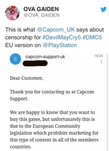 It was originally believed that Devil May Cry V was censored on PS4 due to a recent censorious turn by Sony. Because Capcom’s statement doesn’t address the difference between platforms, it’s possible that DMCV was still censored at Sony’s insistence, with European law providing the rationale Sony needed to make it happen. Fortunately for North American gamers, the absence of similar legislation in North American markets left Sony without an excuse, and Capcom reverted the cutscene to its intended form with the later patch. This is speculation, but the explanation that Capcom independently chose to censor only the PS4 version of DMCV to comply with EU censorship laws doesn’t hold up.