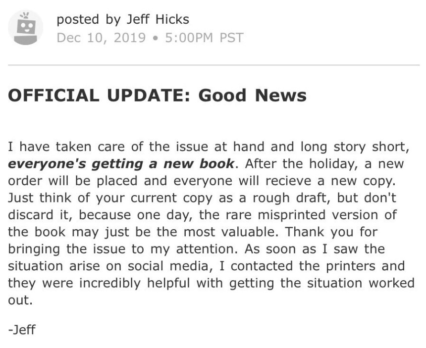 After discussions with the printer following the delivery debacle, Hicks has released a new backer update with good news: all backers will be getting a new, reprinted book, this time shipped appropriately. Hicks noted that the printing company was very helpful in addressing his concerns, though it’s unclear whether Hicks is taking a hit out-of-pocket to make the new print run happen. You can read Hicks’ full backer update below.