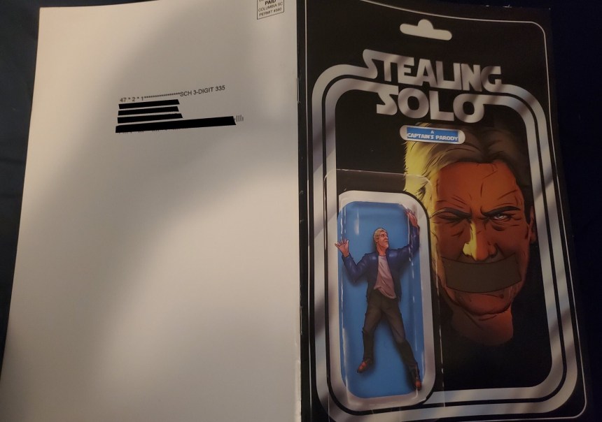 Over the last week, backers of Jeff Hicks’ crowdfunded Star Wars-inspired parody Stealing Solo began receiving their long-awaited books in the mail. Unfortunately, instead of being treated as premium collectibles and shipped accordingly, the books were received with no protective envelope or packaging, with the mailing address physically stamped directly on the back cover (like a Victoria’s Secret catalogue… What?).