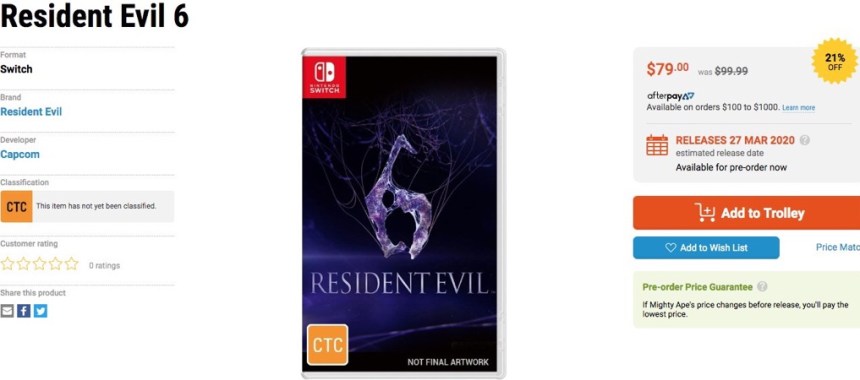 Australian online retailer Mighty Ape has listed standalone physical editions of Resident Evil 5 and Resident Evil 6 for the Nintendo Switch. Both are listed for a 27 March release.