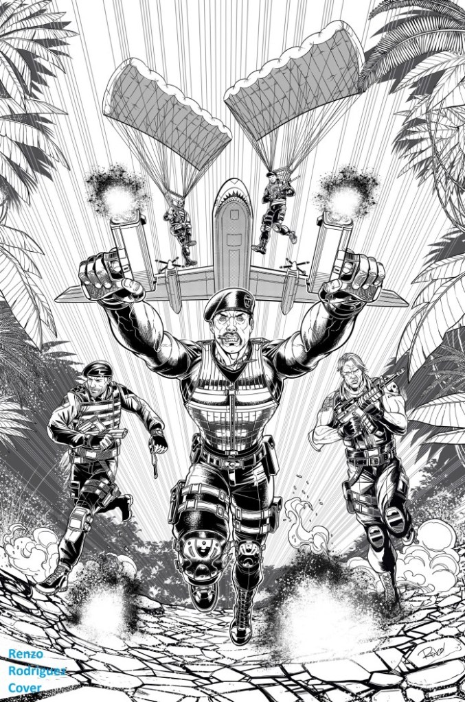 At the time of this writing, the book has already quadrupled its original funding goal, having raised more than $40 thousand. You can check out some sample artwork below or visit the full Expendables Go to Hell Indiegogo campaign page here.