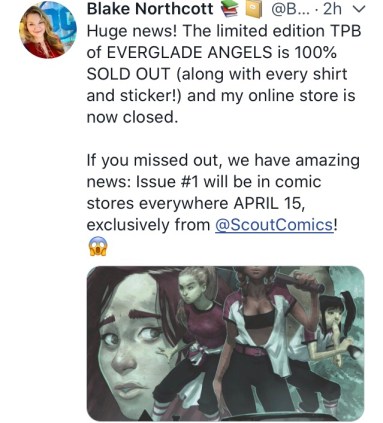 Blake Northcott’s “Everglade Angels” sells out; new printing coming in April from Scout Comics