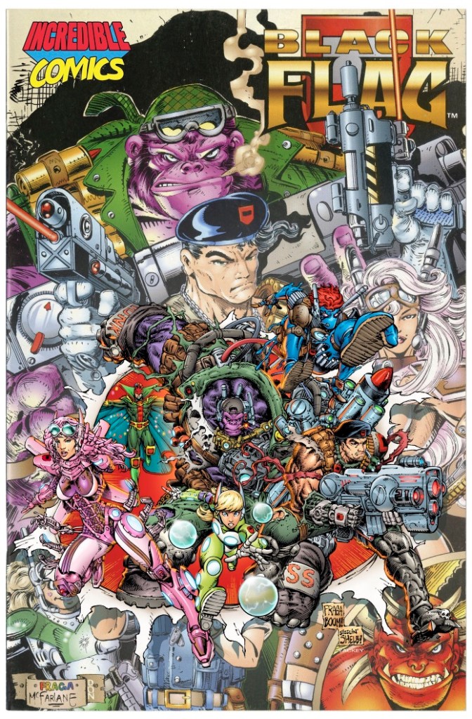 I created BLACK FLAG in 1994. It was my way to draw all of the things that make me happy: Absurdly large gun toting soldiers, sexy anime influenced ladies, magical multi-dimensional wizards, mega contorting aliens, super powered kids, and a giant Purple Gorilla! Who could ask for more?!