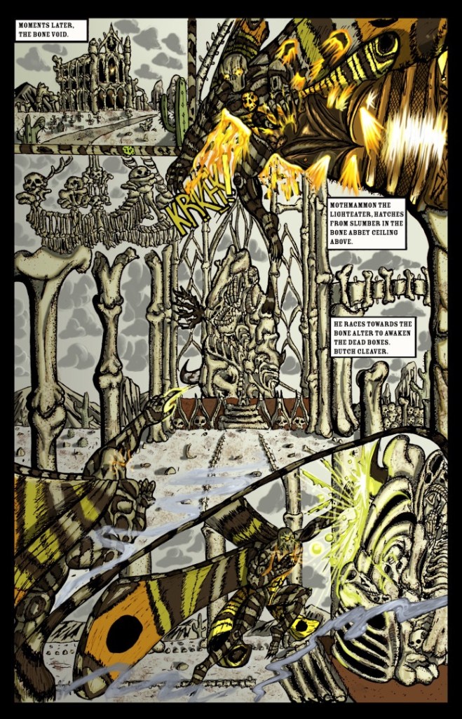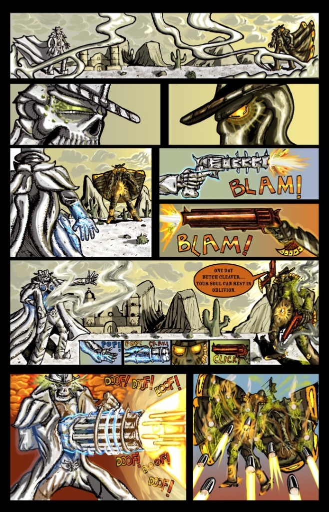 Written and illustrated by Matt Burke, Butch Cleaver is a 72-page fantasy/horror/western inspired by “Spaghetti Western” films, Sin City, and Evil Dead. Here’s the official plot synopsis taken from the Butch Cleaver Indiegogo campaign page: