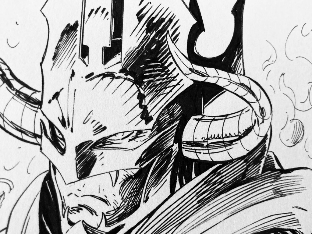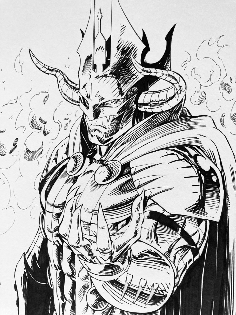 So what are we looking at here? The artwork features a character named Marcion, who is a villain from the Shadow Sentry book. According to Ninaltowski, the name Marcion means “first born of Satan” and he is the first of the “Hell Born.”