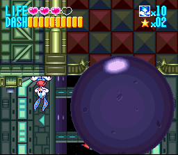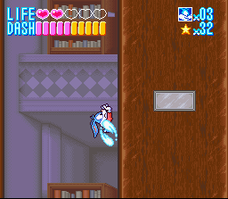 Buster can also dash at high speed and slide under low-hanging surfaces, though this doesn’t mean that the game is trying to be a Sonic clone. Not only does your dash meter run out, but the stage designs don’t mirror SEGA’s Blue Blur in the slightest. One remarkable aspect of Buster’s dash, however, is his ability to run straight up a vertical wall. This is employed several times throughout the Buster Busts Loose, as the player must navigate some rough terrain using skillfully executed wall-jumps. This can make for some exciting moments, but often Buster’s landings are difficult to control when dashing, which can lead to some aggravating deaths, particularly if you are “jumping blind.”