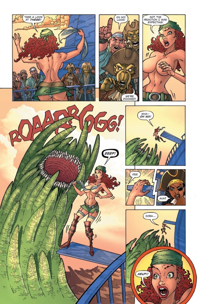 Written by Summers (Super Dead) and featuring illustrations by Clint Hilinski (Sea Dog and Codename: Kill Switch), Pirate Queen is the origin story of a busty redhead named Ava Bloodstone, who seems to have trouble keeping herself fully clothed during her adventures. Oh no!