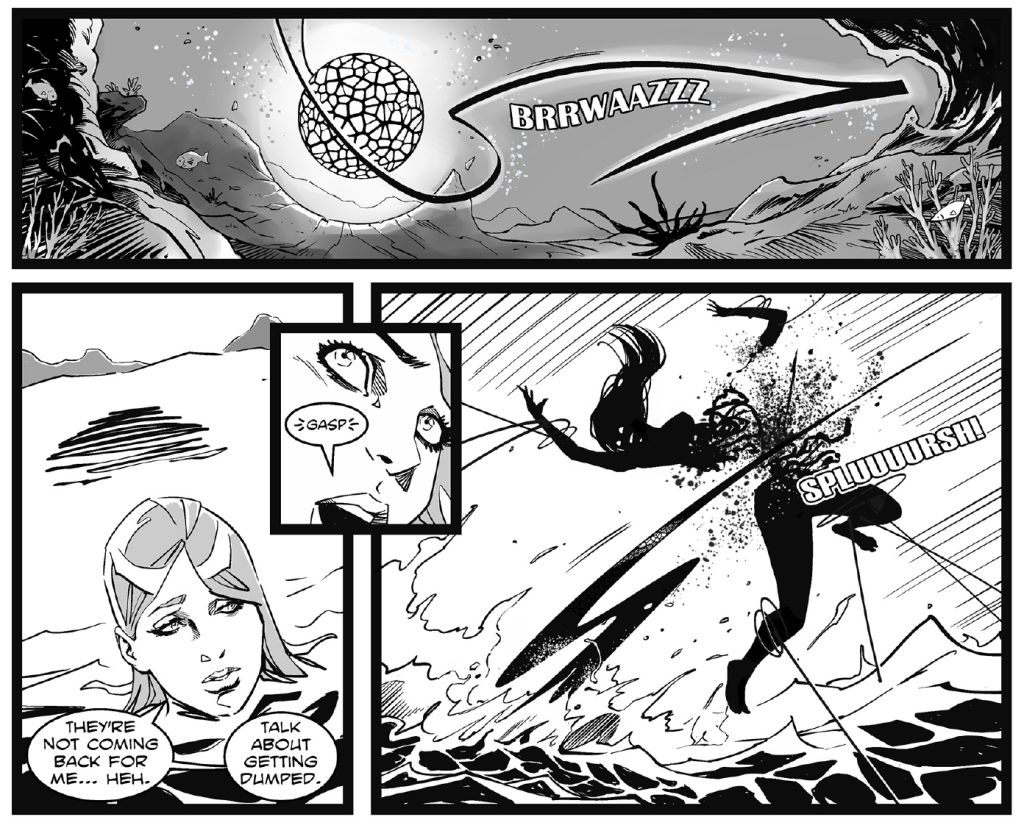 On the artwork side, J.L. Giles does a very good job in visualizing some exceptionally gruesome deaths. The shading of the creatures and the underwater shadows are more compelling than the scenes above water, but overall, I’d give the art very high marks. There are also plenty of topless shots of the vacationing ladies for those who would be interested in that sort of thing… whoever you are…