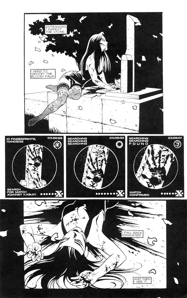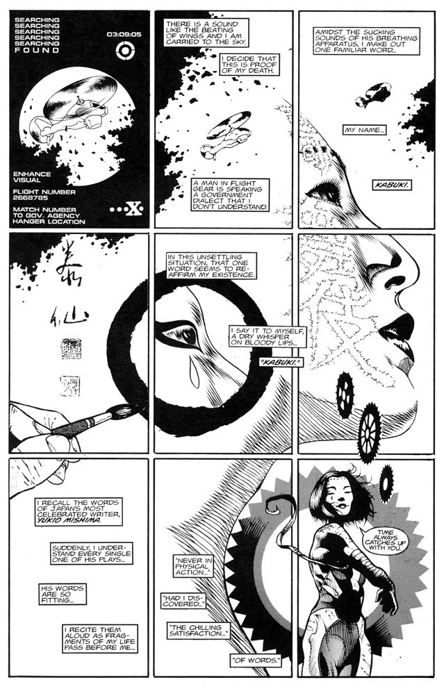 Another great thing about the Kabuki series is the artwork. A completely different artist is selected to draw each assassin. This is a very inspired approach, leaving readers stimulated to read slower, enjoying the variety in each character’s weapons and clothing. However, you may not even know that there was a different artist if you’re not aware ahead of time, as the character artwork is so deftly in sync with the overall style.
