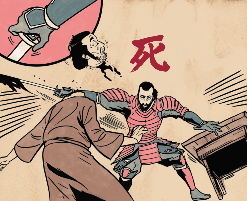 There is no doubt that the book is intended for adult readers. While there isn’t any full nudity, there’s plenty of blade-borne death, all punctuated with a blood red death kanji image (“Death” written in Japanese text) hovering over the kill.