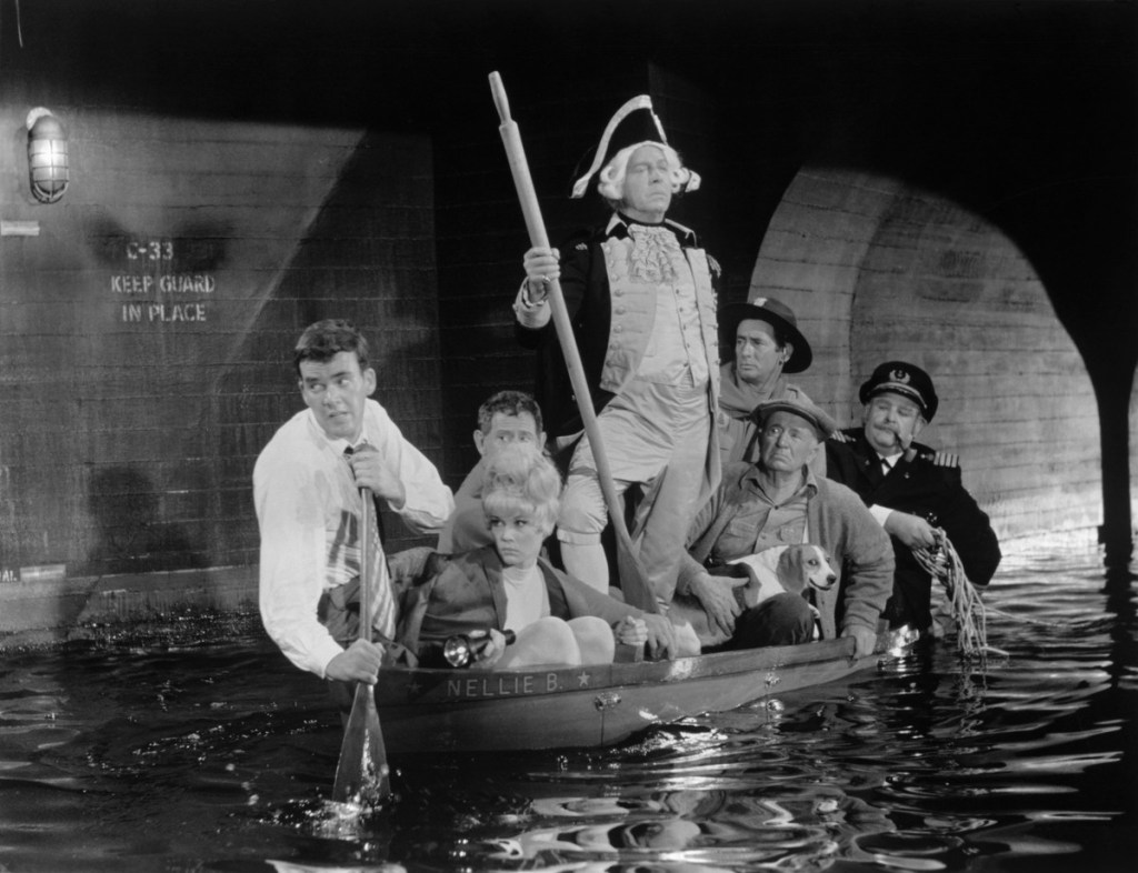 Enter Luther Burton (Milton Berle, 1966 Batman’s Louie The Lilac), a pawn shop owner with the necessary hearing aid who catches wind of what Harry and the bunch are up to after Avery inadvertently tips the hand of his employers. It snowballs from there, picking up Ralph (Joey Bishop) from public works who knows the layout of the sewers, and a ship builder (Victor Buono, also of 1966 Batman fame – King Tut anyone?) to construct a boat small enough to fit through the manhole yet still navigate the flooded sections of the sewer.