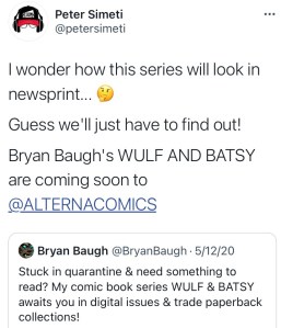 On Wednesday, Alterna Comics founder Peter Simeti announced that Bryan Baugh’s Wulf and Batsy series will indeed be published by Alterna.