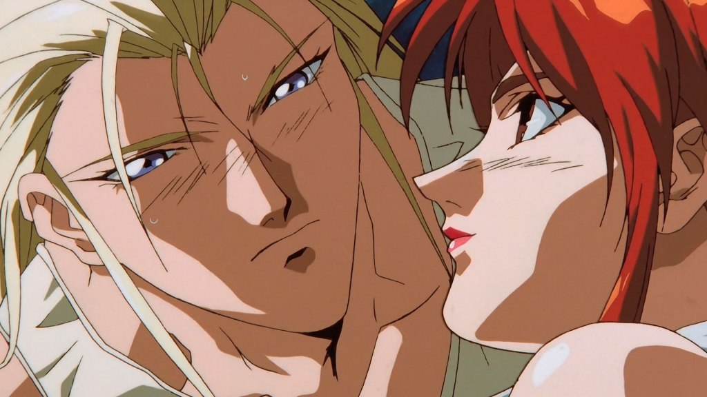 Character development aside, there’s plenty of cameos from the franchise throughout, plus one from Samurai Shodown if you watch carefully during a dance club scene roughly halfway into the film. Mai Shiranui supplies ample fanservice for the complete runtime, her dual suspension bouncing so much it likely set off the Jiggle CounterTM feature on nearby ADV video releases back then. Masami Obari, true to form serves up cheesecake and beefcake for both sexes as every male is a pretty boy that goes topless at some point or other.