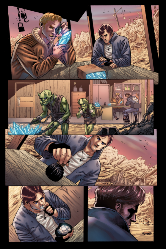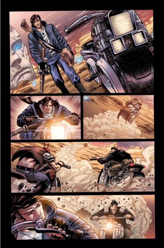 Written by Chimera and featuring illustrations by Juliano Silva, colors by Marcos Martin, and letters by (drum roll, please…) Eric Weathers (Battle Brick Road), Testament is a science fiction/fantasy book akin to Mad Max and Vampire Hunter D.