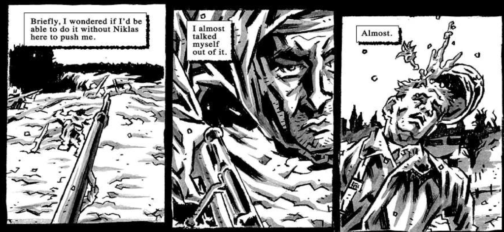 The real disappointment is that the art fails to carry the weight of the story. The limited palette is very dark and gritty with thick inks and heavy gray tones. The style is a bit primitive and is frequently zoomed in very close to the characters. The effect is that open-country combat feels small. In some panels, the lines are so heavy that it’s difficult to discern what is occurring. Was that a head shot to a Russian soldier, or is this the anguish on the face of the sniper? Exploring the horror of a white out turn into an ambush of gunfire and Molotov cocktails on a two page splash of action seems like an opportunity missed. Add in a map or two to graphically reinforce the uselessness of the battles, and the effect would be more pronounced, in my opinion.