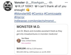 After a strong post-release push, Rise Again Comics’ Monster M.D. finally reached the blessed “six figures” milestone, raising more than $100k via Indiegogo.