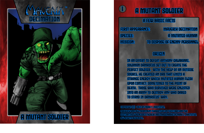 The cards themselves featured artwork by Mactutus on the front with character facts and origins on the back. The cards were a dual finish where the face of the card had a matte finish and the back of the card was just printed card stock.