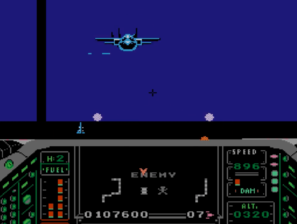 Hawke must use all of these weapons to take down the blue planes, reddish-orange planes, and gun towers scattered throughout each stage. The actual gameplay area is just over half the screen, but the scaling and rotation, while clunky, really isn’t that bad for the 8-bit NES. The small play area makes it hard to maneuver and react, though. Enemies just sort of pop up, as do their missiles. They aren’t on your radar. The only things that are on your radar are the locations of escaped hostages, refueling points, and enemy airfields.