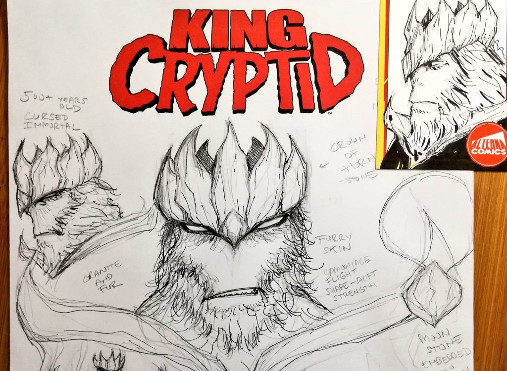 That’s about all the information we have for now. Oh bollocks! We almost cut out of here without sharing Simeti’s first sketches of the King Cryptid character himself! Dopey me. Here ya’ go.