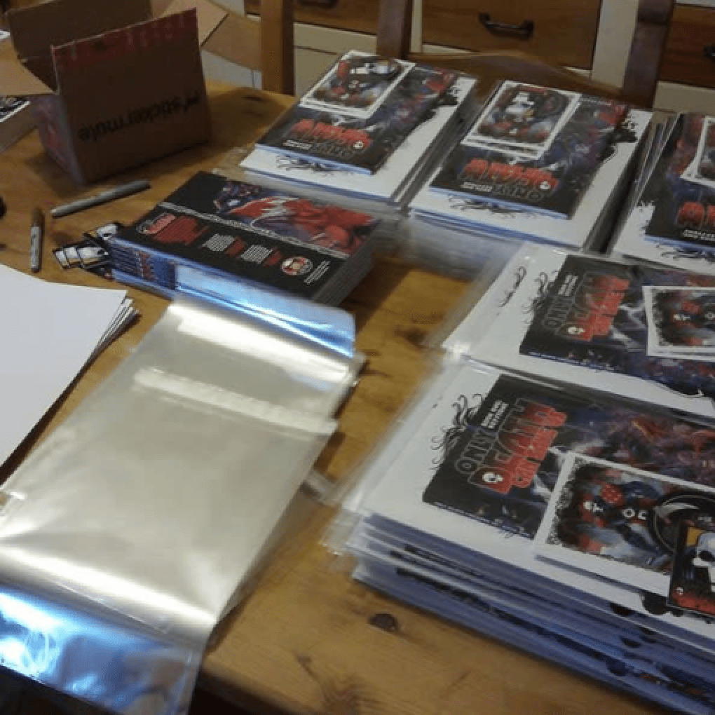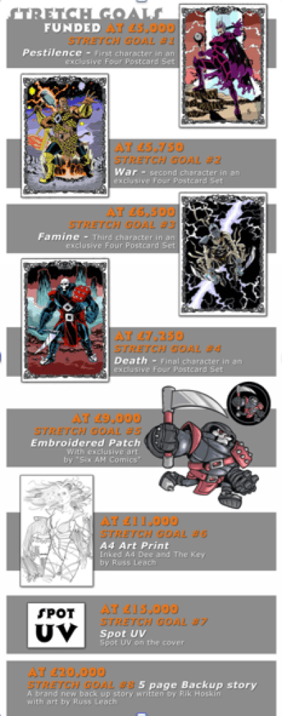 There were eight stretch goals, one at a single backer, then one at £5,000, £5,750, £6,500, £7,250, £9,000, £11,000, £15,000 and £20,000, which are all very reasonable for a campaign from a 30+-year veteran. Having reached £11,240, the campaign unlocked the first six of the planned stretch goals. These included four character prints, a patch with art by SixAmComics, and an inked A4 Dee and the Key art print.