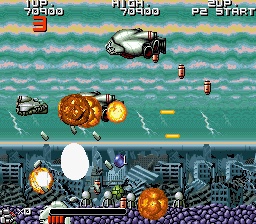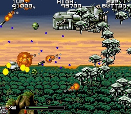 In Bio-Ship Paladin, players use a variety of weapons and power ups to defeat enemies known as “The Aggressors”). While very much a space shooter of its time, Bio-Ship Paladin’s unique hook is that your ship can fire both standard forward shots in addition to multidirectional shots that are fired by aiming a separate targeting reticle, similar to Missile Command or Global Defense.