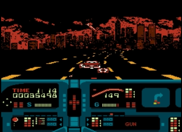 Other than Houston, most of the stages play out the same way, with the player speeding along, avoiding traffic, shooting the bad guys, and reaching the boss fight before time expires. Even the music, while catchy, doesn’t change between stages. The boss fights come in the form of larger enemy vehicles (i.e. semi trucks and attack helicopters). They’re pretty damn quick, so you’ll need to keep moving or they’ll blow you straight to hell. They definitely take quite a few hits to take down, but be patient and focus on surviving and get your hits in where you can.