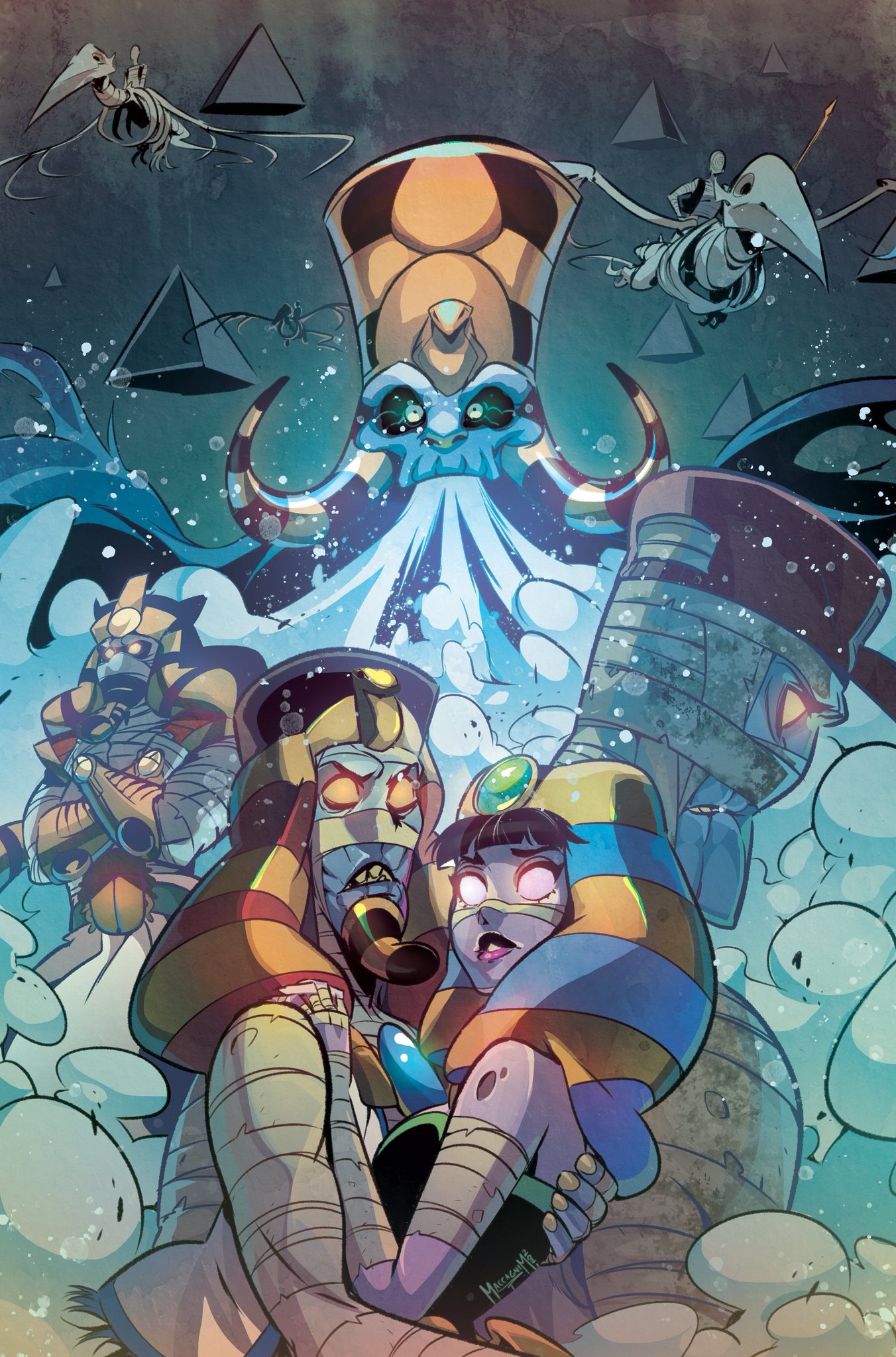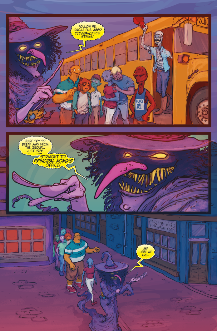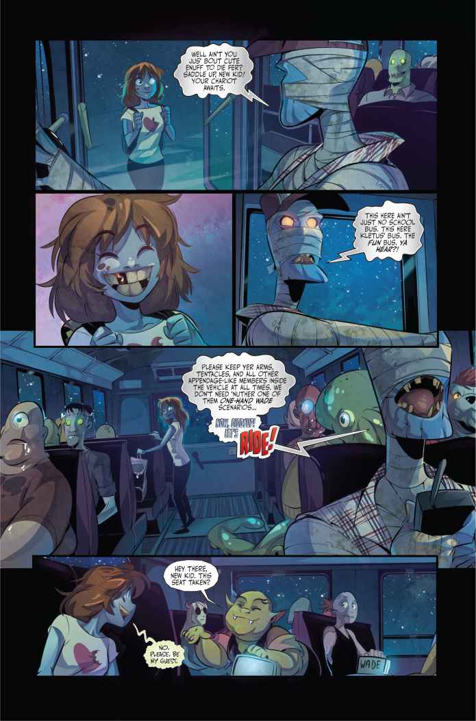 Written by Von Klaus and with art by Monika Maccagni, the superstar writer-and-artist team behind last year’s crowdfunding sensation, Monster M.D., “The Tale of Kleotep” invites readers to explore the enigmatic past of K.Thulhu High’s moonshine-guzzlin’, banjo-playin’, tobacco-chewin’ Mummy schoolbus driver known only as Kletus.