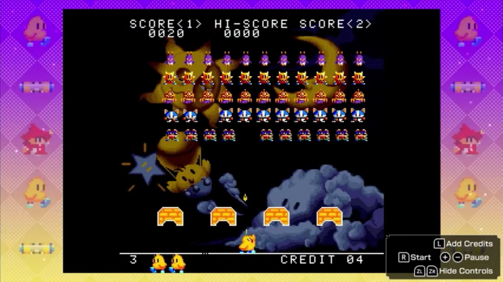 Parody mode changes the game’s background and characters to more colorful sprites, many from other Taito games such as Arkanoid and Bubble Bobble. Enemies include cats, knights, devils, etc., and even your player’s “ship” changes from stage to stage, where it takes the form of a baby chick, red mage, etc.