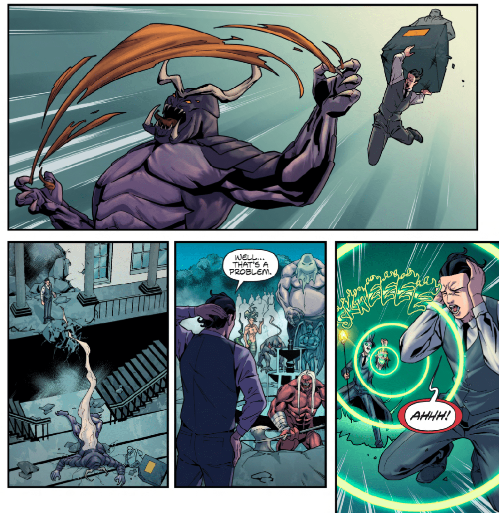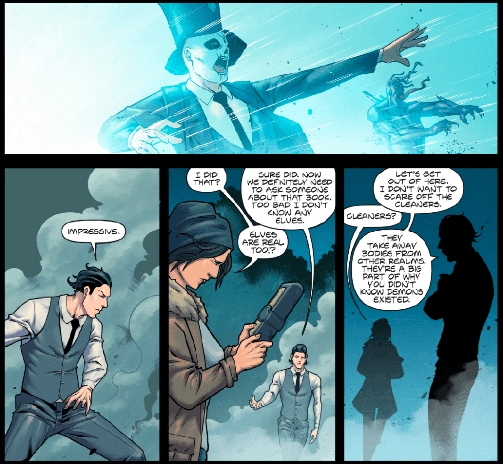 I found the story to be entertaining, despite the rough beginning. The first issue focuses more on Mei, a naïve college student, who seemingly becomes Blackwell’s “partner”. She was chosen by the Grimoire, the ‘most powerful spell book in the four realms’. Unfortunately, we know very little about Mei’s background or why she was chosen, but because she was, the demons target her. Hopefully, more will be revealed in future chapters. Now a young adult, Damian Blackwell meets Mei when he comes to her rescue after the demons kidnap her, only to get into more confrontations with them before issue one ends.