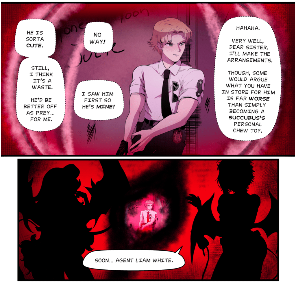 TS: Mythological succubus lore can often be really gross, with a succubus stealing men’s sperm to implant into an incubus demon, who in turn uses it to impregnate a human woman. Are you intending to dive deep into the subject matter in this way, or is your plan to stay with a more lighthearted take on the lore? Is your hero, agent Liam White, really in any supernatural danger if he just gives in to his partner’s charms from time to time?