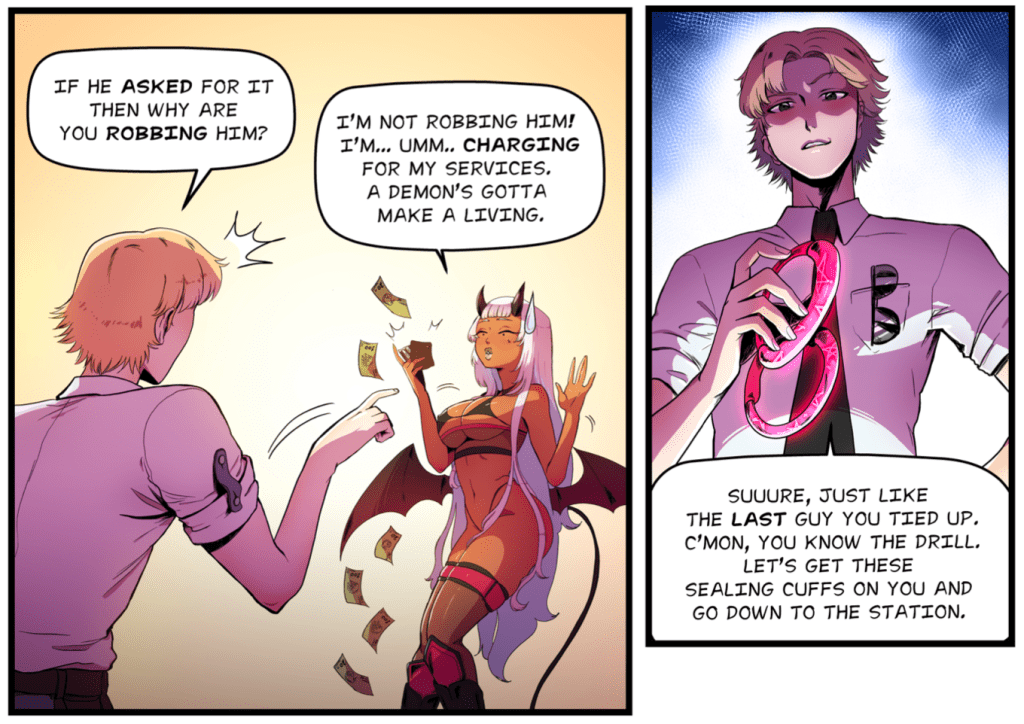 IF: SuccuBUSTED!’s demons are bound by certain rules and restrictions. In the case of a succubus/incubus, human attention fuels their powers. The more lusted for or worshipped they are, the more power they have. However, this only works if the attention is consensual. Hypnosis or force will do nothing for them. (Though hypnosis is helpful in stealing a wallet.) How various demons work is explained over time in the series through organic conversation. Liam is in no danger from Rita, even if he does or does not become romantically involved with her. Rather, the danger comes from human society who may greet such a relationship with direct hostility.