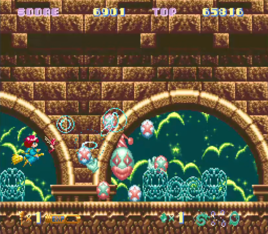 Cotton has a wide array of magical skills at her disposal, including rudimentary magical blasts that are upgraded as you collect yellow and red magic crystals, and arched “bomb” attack, and magical super attacks that do substantial amounts of damage. You can also collect more fairies in addition to Silk, whose flight pattern can be swapped on the fly! (Kill me)