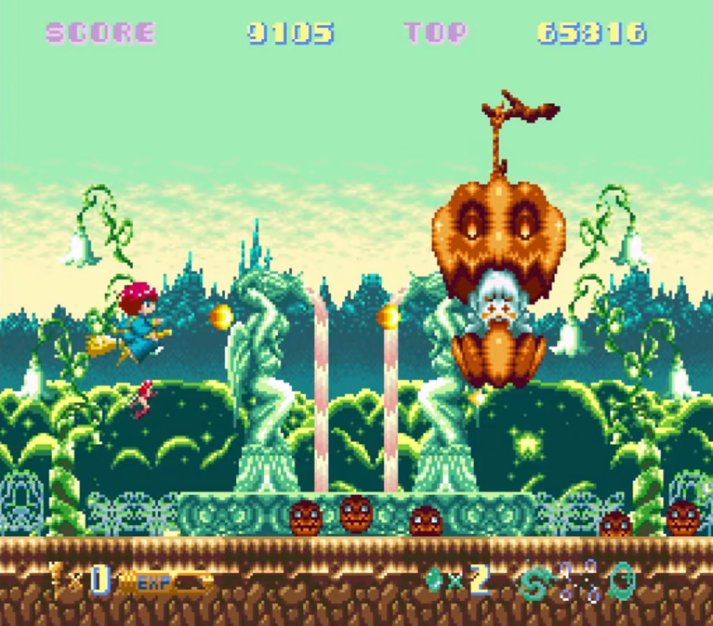 The enemies may be slightly standard fantasy-inspired fare, but at least they offers a change of pace from the sci-fi inspired, 90s-era contemporaries. They include axe-throwing goblins, evil fairies, flying eyeballs, winged demons, etc. Every stage also has two bosses with which to contend, which helps to extend the game a bit as the stages are actually fairly short. The mid-bosses tend to be fairly simple battles, while the final bosses take a bit more finesse to take down. These bosses take the form of oversized mushroom, a flying clown face, and a giant Jack-O-Lantern, but my personal favorite design was the possessed tree infested with ill-tempered squirrels.