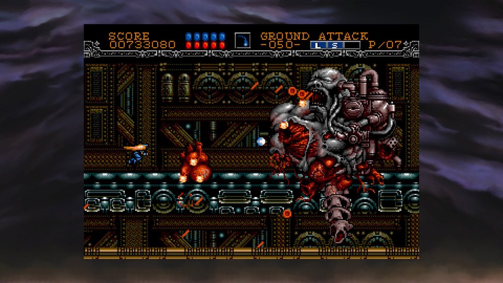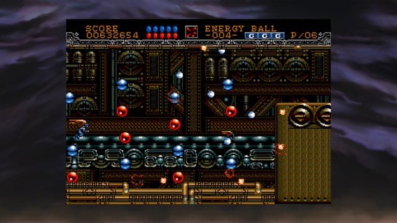 Your journey begins at the center of the planet Iccus, and takes you to the heavens above. You will traverse a cavern, submarine waterways, ancient ruins, a steampunk-esqe machine stage, a grotesque biological tube, and finally, the skies high above the planet. Several of the stages have background rotation and scrolling effects that may not impress modern gamers too much, but old school Genesis fans will probably be impressed by some of these tricks. However, I highly recommend turning on the scan lines filter if your eyes are sensitive to bright colors, as the “bio tube” stage is a lot to take in without something to tone it down.