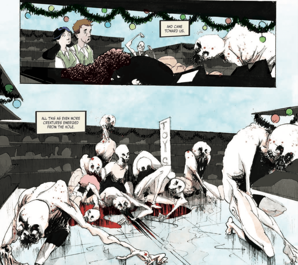 Scout Comics’ Black Friday takes place in a fictitious big box retail store named Star-Mart, which has just closed its doors after a long Black Friday sales day. While cleaning and restocking the store, two Star-Mart staff employees named Javier and Ceci discover a bloody stain on the floor. After realizing that there was a similar incident on Black Friday the previous year in the exact same location in the store, the two start to investigate the more closely. They eventually find a dark pit filled with mangled bodies, and that’s the end of issue one.