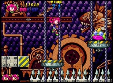 Everything about Clockwork Aquario – the stages, the heroes, and the enemies – is vibrant and colorful, and features lots of large sprites. Huck, Elle and Gush are illustrated in trademark Westone fashion, and are also fairly large for a platformer, which has both its benefits and its drawbacks. Sure, it’s impressive to have larger, more detailed heroes, but this predictably leaves you with less room to maneuver around the screen, which can cause frustrations from time to time. If nothing else, this gave Westone a chance to try to something interesting with your life meter, as your character takes battle damage when hit. The soundtrack is fittingly light and upbeat, and matches the onscreen action very well.