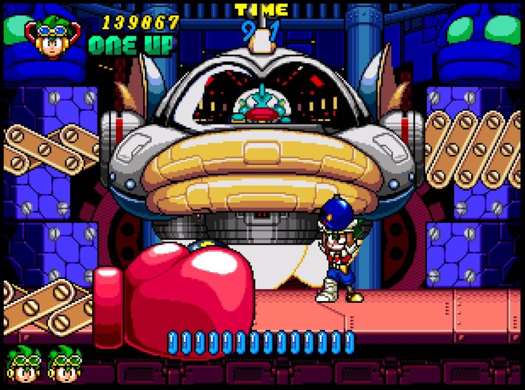 The gameplay takes a few tries to get used to, particularly when you’re playing with a character with shorter reach (Huck and Elle). As a result, I don’t think Clockwork Aquario would have done well as an arcade game. It may be a blessing in disguise that everyone’s first hands-on experience with it is at home, because now we all have the chance to experiment and get the hang of things (and start by playing as Gush) without dropping a pocketful of quarters. And at the end of the day (erm, decades), Clockwork Aquario is an enjoyable game with relatively well-balanced difficulty given its 90s arcade roots. Knocking out enemies from across the screen and wailing on bosses with a gold power up star is indeed a fun time.