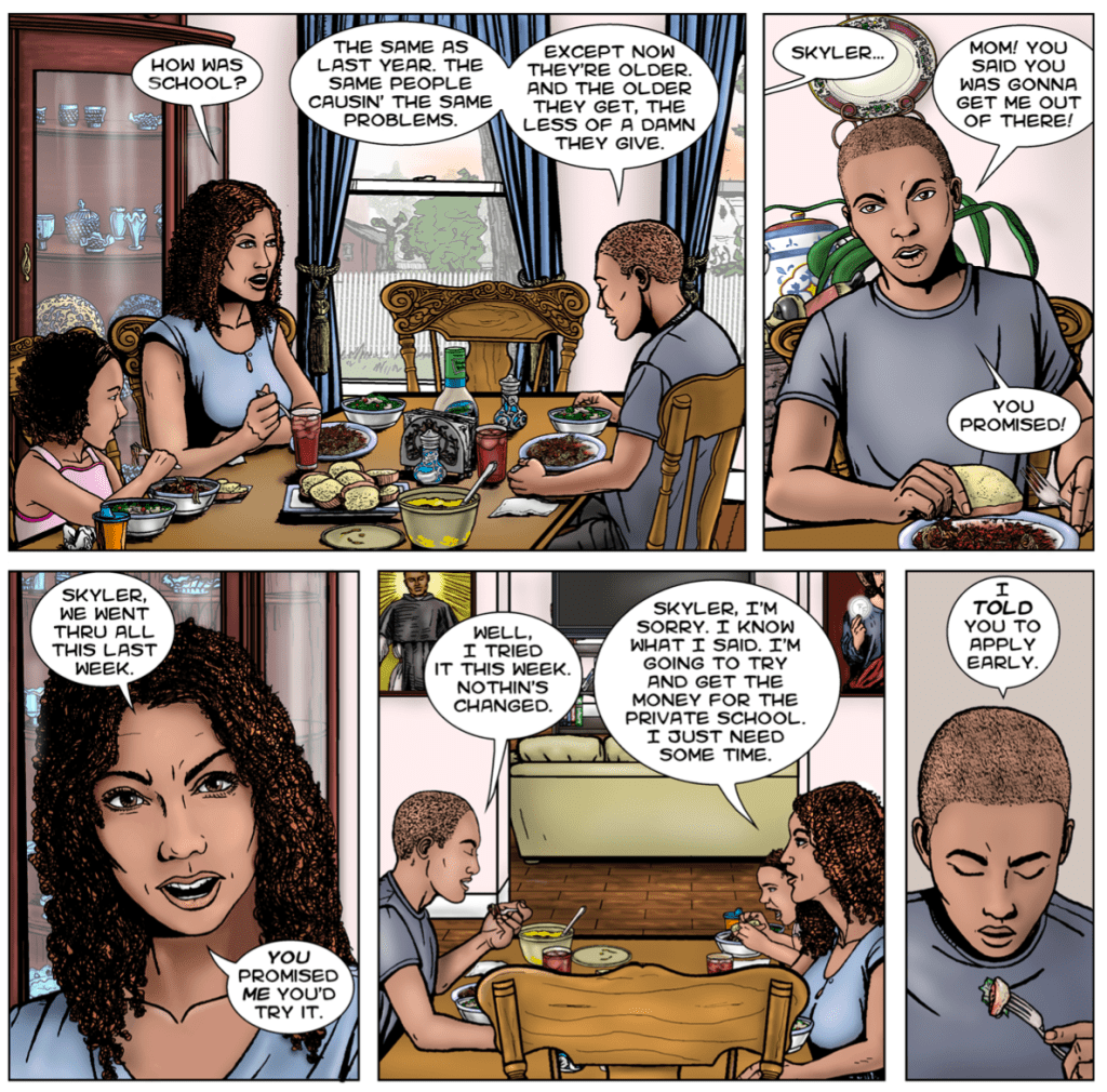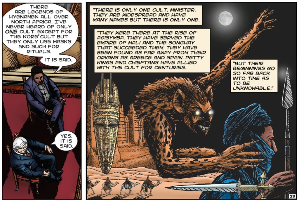 In any case, the story of LionMan book one is split between two primary characters, the first being Skyler, the young teen hero of the story who is dealing with the challenges of going urban public schools, Sir Michael Baker, an older gentleman who acts as the wise agent of plot exposition. Skyler and his mother have been trying unsuccessfully to get him into a private school. In the meantime, Skyler is confronted with a neighborhood delinquent named Dwan, who acts as the villain of this first book. This all leads to a violent confrontation late in the book, where Skyler comes upon a special medallion that gives its wearer unique powers when activated by blood. This is all part of an ancient struggle between the the Amadlozi (or “ancestors”) and an evil group known only as the Hyena Cult.