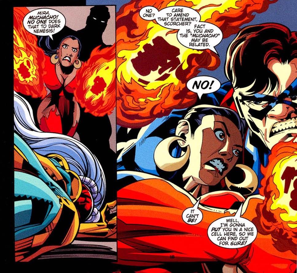 Dark Nemesis is centered around a five-member team of super-villains: Axis (Woman with psychic powers and leader of the team), Vault (oversized mute who can create energy prisons), Carom (fast guy), Scorcher (a Spanish speaking fire-lady), and Blizard (an ice-powered lizard person. Get it?). The Atom manages to secure the release of an imprisoned, lesser-known Titan named Risk, to help him ensure that the at-large Scorcher is unable to spring her four teammates from prison.