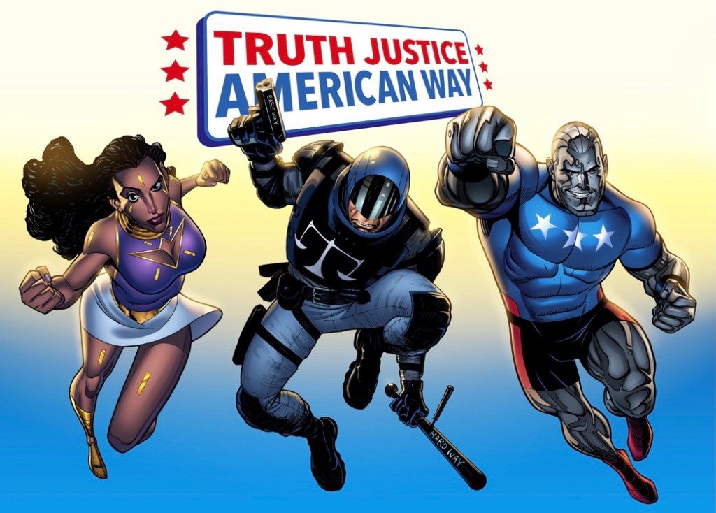 Here’s the official pitch taken from the Truth Justice American Way pre-launch page, followed by the first look at the book’s titular trio of heroes:
