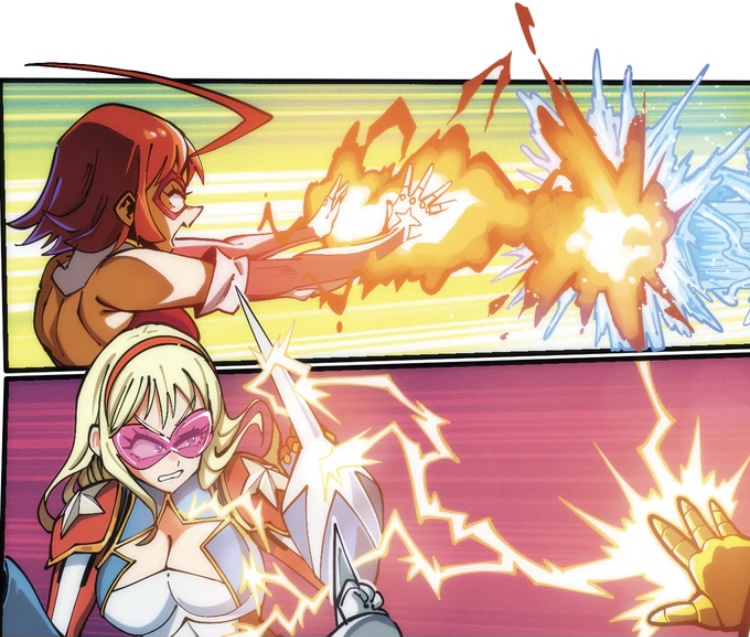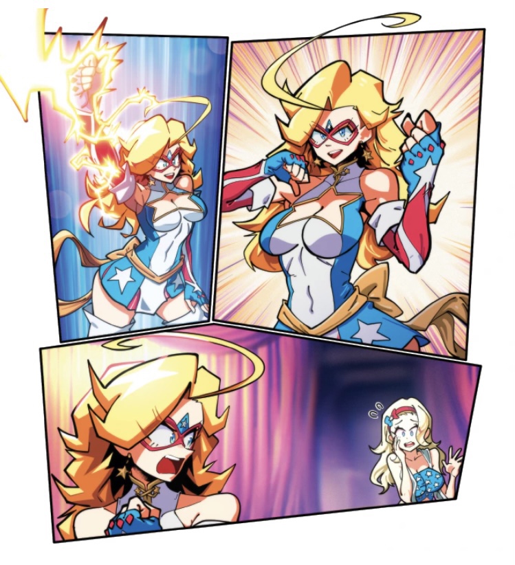 “Charlotte ‘Carly’ Vanders was a USO entertainer with dreams of being a fashion designer. After a fateful encounter with cosmic debris, she becomes a human battery with the ability to harness and weaponize her bioelectricity. Supercharged with a spirit of self-determination and persuaded to be a masked fighter for justice, she became the Fighting Fashionista, the Patriotic Paladin known as KAMEN AMERICA!”